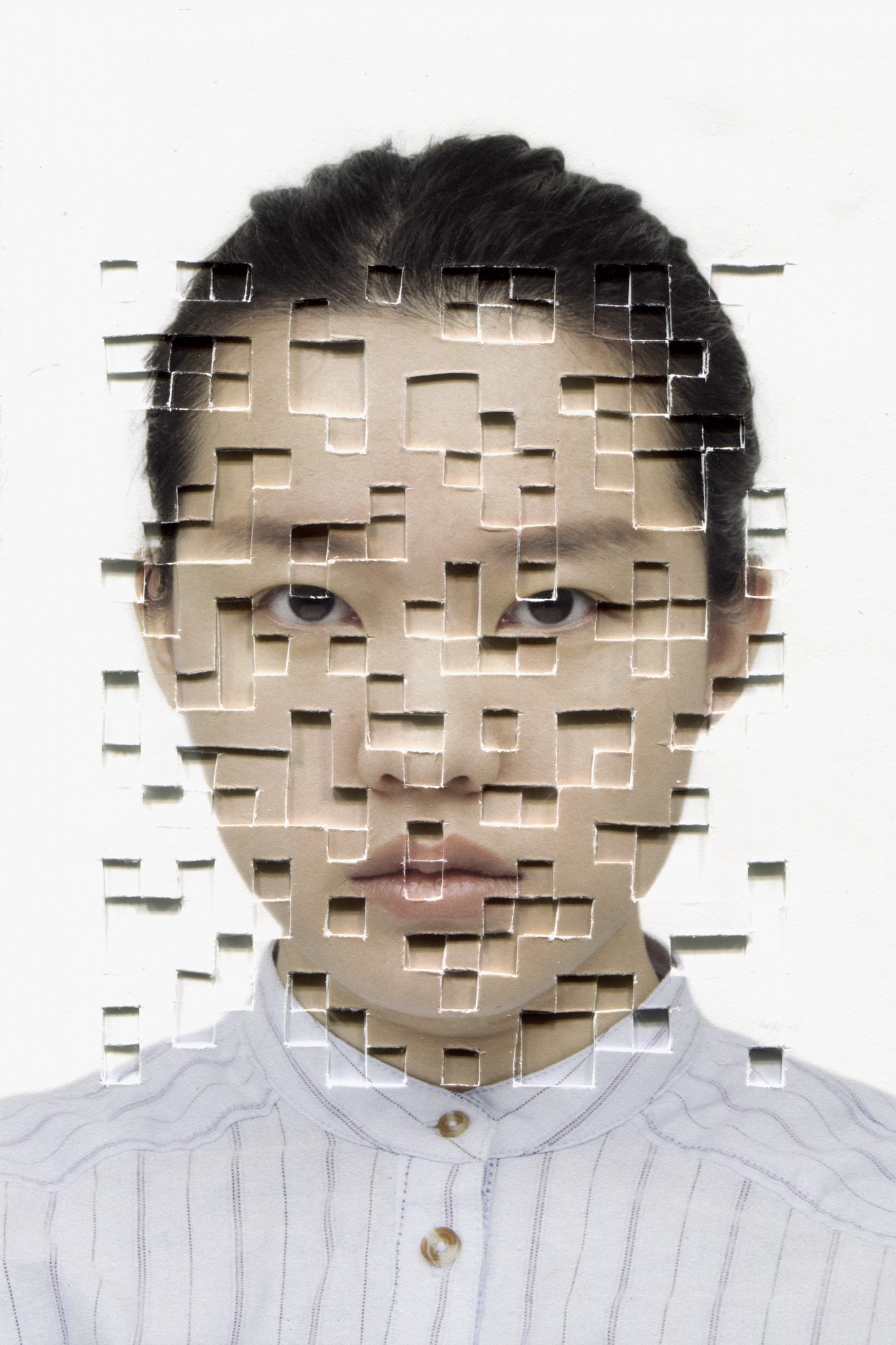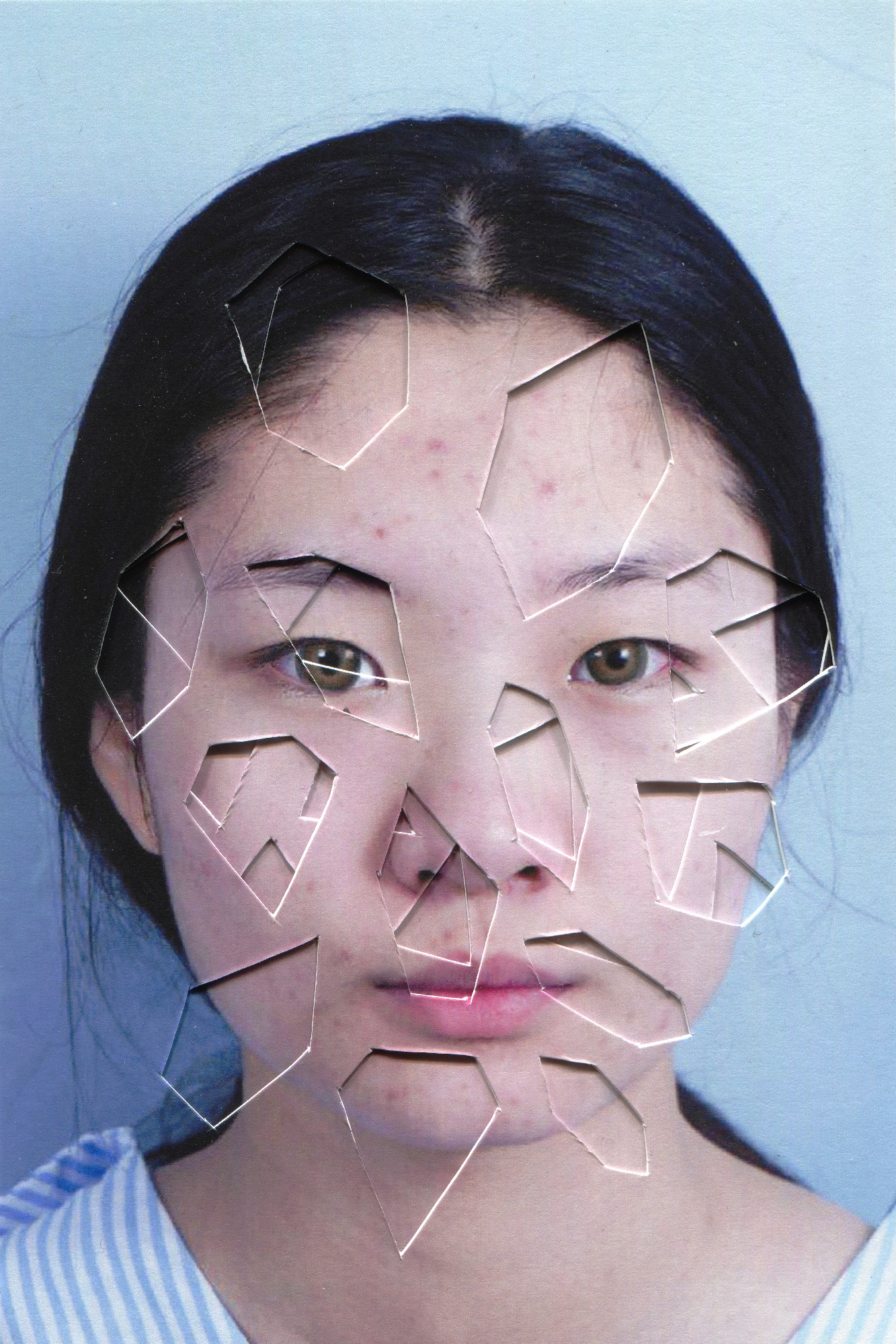 While 'collaborating' with the clinics on the diagnosis portraits, I photographed their interiors, which features an ambiguous coexistence of medical and commercial elements. I also collected pre-surgery portraits of people who have undergone cosmetic surgeries, taken by clinics and posted on cosmetic surgery portal websites for promotion, covered with the websites’ watermarks. Despite being photographed in an objective manner, they reveal to me a mixture of feelings from melancholy to puzzlement, hope, restlessness, determination, nostalgia...They remind me of death masks used to preserve faces after death, post-mortem photography, or all photographs that are indexical of mortality. I removed the watermarks from the portraits, transformed them into masks that I wore, and added new watermarks featuring Chinese words associated with appearance shaming on both our faces. And, inspired by the 'portrait-robot' - a tool used by 20th century police to create facial composites of criminal suspects, I removed our facial features, which is both a documentary of faces stigmatized, and a resistance against the social gaze. I also cut patterns on my portraits, 'transplanting' their experience onto me. At this moment, they are me and I am them.